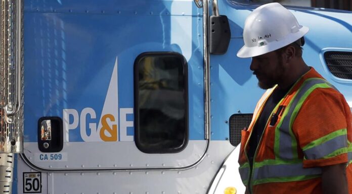 A PG&E worker walks in front of a truck in San Francisco. AP Photo/Jeff Chiu
