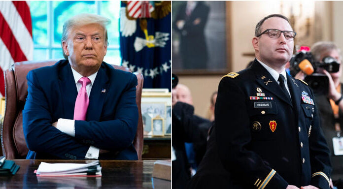 A composite image of then-President Donald Trump (left) and Lt. Col. Alexander Vindman, who is now retired. Doug Mills-Pool/Getty Images; Tom Williams/CQ-Roll Call via Getty