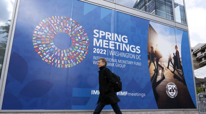 A person walks outside of the International Monetary Fund (IMF) building, during the first day of the World Bank/IMF Spring meetings in Washington, Tuesday, April 19, 2022. - (AP Photo/Jose Luis Magana)