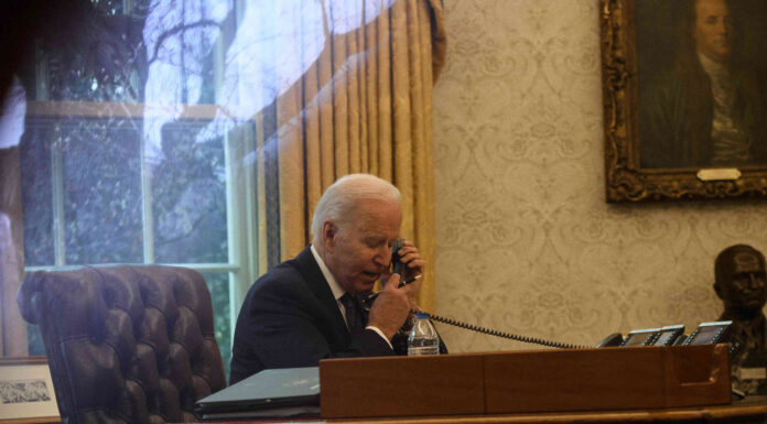 President Biden speaks on the phone to his Ukrainian counterpart Volodymyr Zelensky in the Oval Office on March 30. (Nicholas Kamm/AFP via Getty Images)