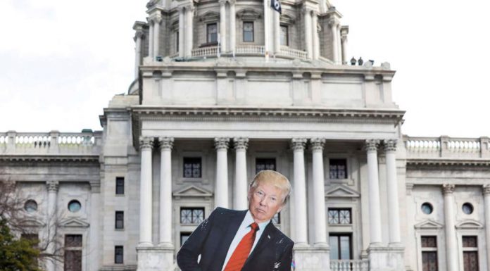 A cardboard cutout depicting President Donald Trump is seen in front of Pennsylvania Capitol, Jan. 17, 2021. - Rachel Wisniewski/Reuters