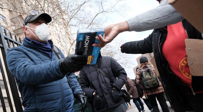 City workers hand out take-home Covid-19 test kits in lower Manhattan on December 23, 2021 in New York City. Spencer Platt/Getty Images