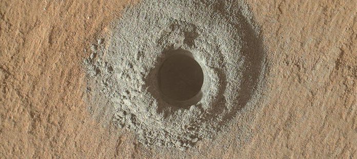 One of the drill holes used to sample sediment in the Gale crater. - NASA/Caltech-JPL/MSSS