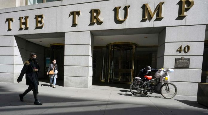 FILE - Pedestrians and a food delivery man are seen outside the Trump building at 40 Wall Street in New York's Financial District, Tuesday, March 23, 2021. The New York attorney general, Tuesday, Jan. 18, 2022, says her investigators have uncovered evidence that former President Donald Trump's company used "fraudulent or misleading" valuations of its golf clubs,...