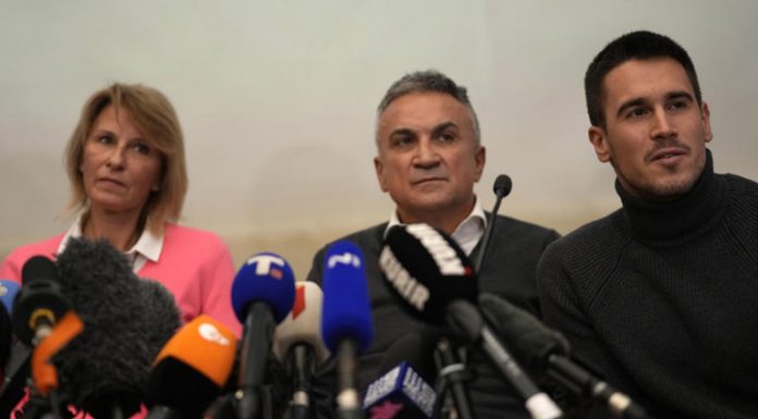 Serbia's Novak Djokovic's father Srdjan, center, brother Djordje, right, and mother Dijana attend a press conference in Belgrade, Serbia, Monday, Jan. 10, 2022. Tennis star Novak Djokovic on Monday won a court battle to stay in Australia to contest the Australian Open despite being unvaccinated against COVID-19, but the government threatened to cancel his visa a second...