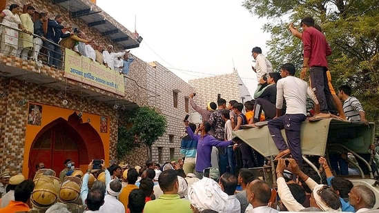 BJP leader Manish Grover and others were allegedly kept hostage by farmers for several hours at the Shiva temple in Rohtak's Kiloi village (Manoj Dhaka/ Hindustan Times)