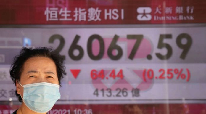 A woman wearing a face mask walks past a bank's electronic board showing the Hong Kong share index in Hong Kong, Tuesday, Oct. 26, 2021. Asian shares were mostly higher Tuesday after another rally to a record high on Wall Street. (AP Photo/Kin Cheung)