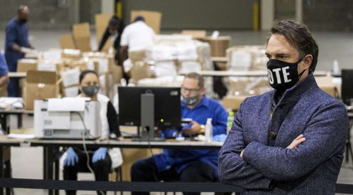 FILE - In this Nov. 25, 2020 file photo, Fulton County Georgia election chief Rick Barron talks to reporters as workers scan ballots during a presidential recount in Atlanta. Officials in Georgia's most populous county, where election operations are already under review by the state, have fired two workers accused of shredding paper voter registration...