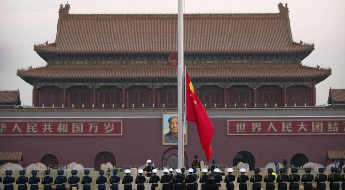 A Chinese honor guard raises the national flag of China at dawn on Tiananmen Square in Beijing. - (AP Photo/Mark Schiefelbein)