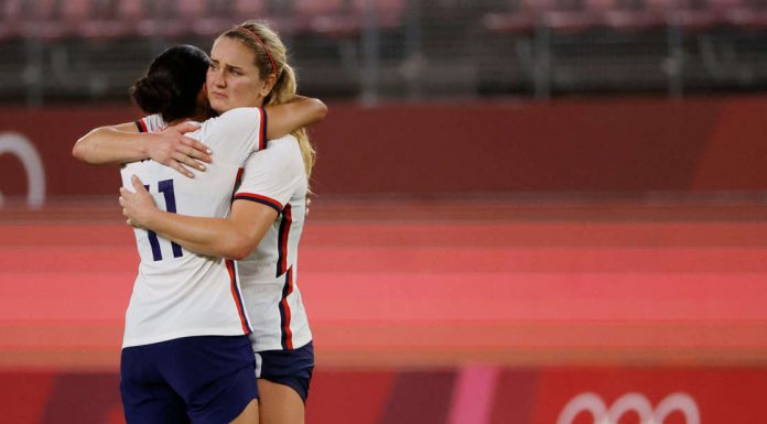 Christen Press, left, and Lindsay Horan console each other after the U.S. lost to Canada in the semifinals at the Tokyo Olympics. - Geoff Burke, USA TODAY Sports