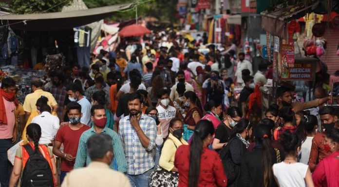 Heavy rush of shoppers seen at Sarojani Nagar Market despite rise in coronavirus cases, on April 5, 2021 in New Delhi, India.- Raj K Raj/Hindustan Times via Getty Images