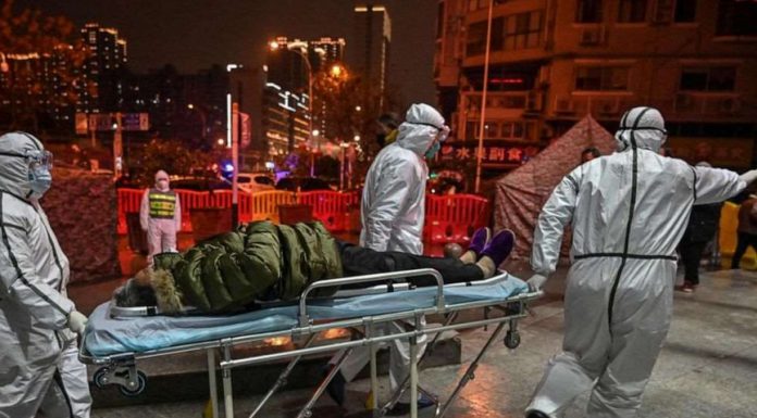 FILE PHOTO: Medical staff members wearing protective clothing to help stop the spread of a deadly virus which began in the city, arrive with a patient at the Wuhan Red Cross Hospital in Wuhan, China, Jan. 25, 2020. - Hector Retamal/AFP via Getty Images