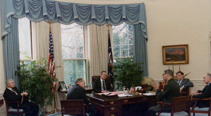 President George H.W. Bush meets with Defense Secretary Dick Cheney among others while seated at the C&O desk (U.S. National Archives and Records Administration)